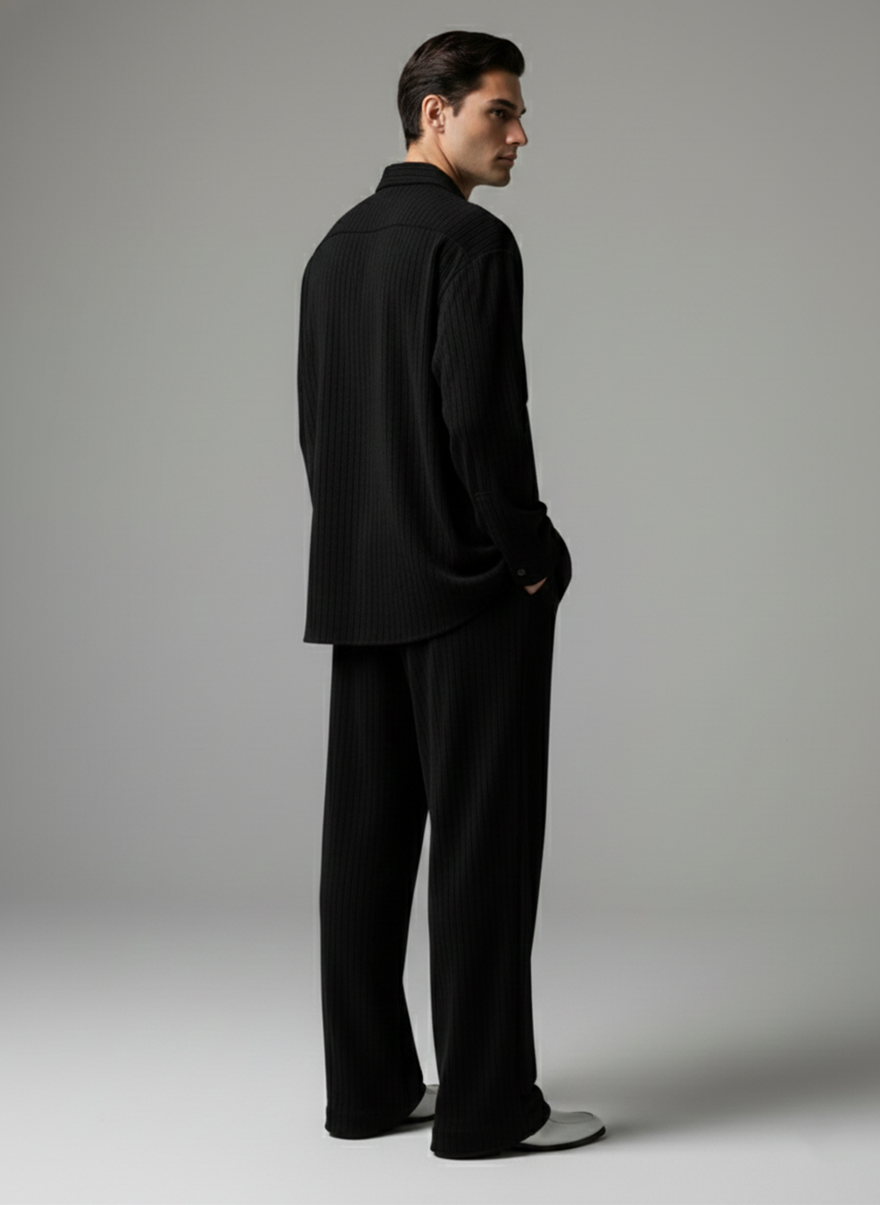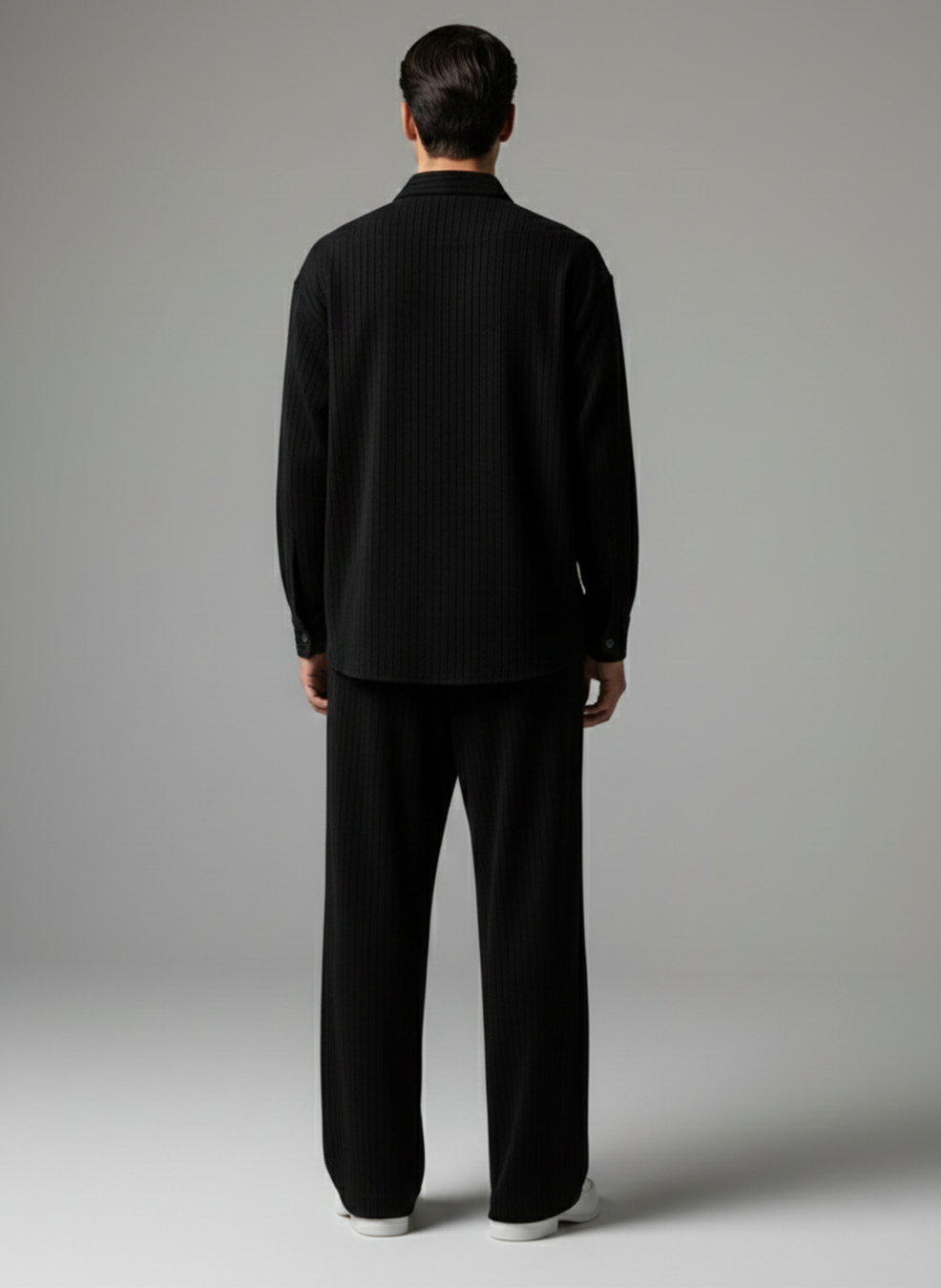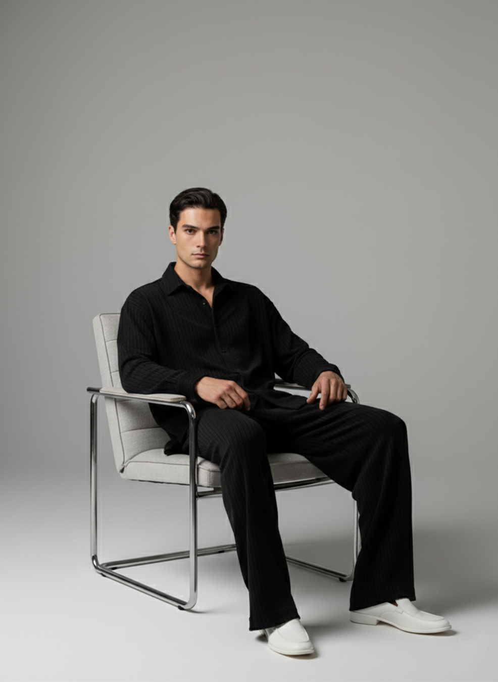 This black corduroy co-ord set features a textured boxy-fit shirt paired with loose-fit trousers for a clean, elevated casual look. The soft corduroy adds structure and comfort, making it ideal for everyday or semi-formal styling.