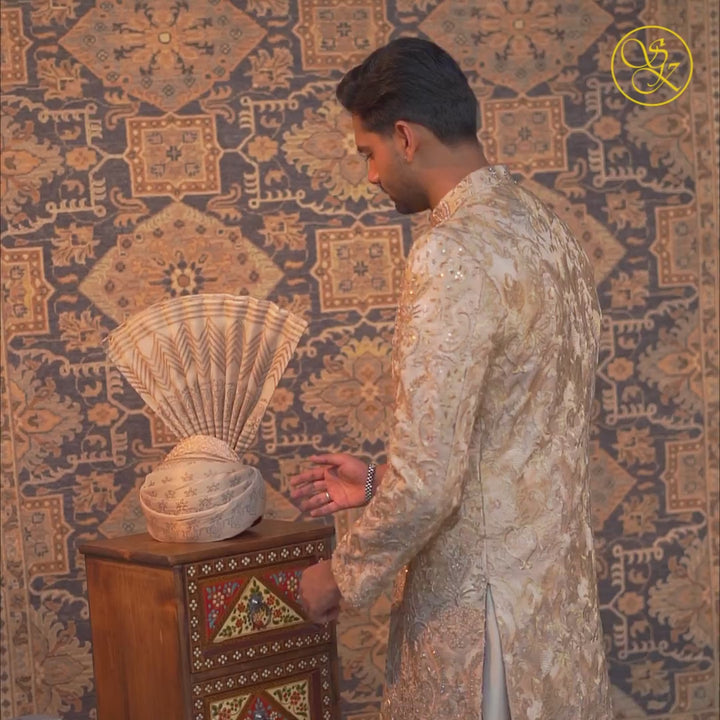 Make a majestic statement with this classic cream sherwani, masterfully adorned with detailed floral embroidery and intricate linear motifs. Fully embellished for a luxurious finish, this sherwani is designed to exude timeless sophistication and royal charm.